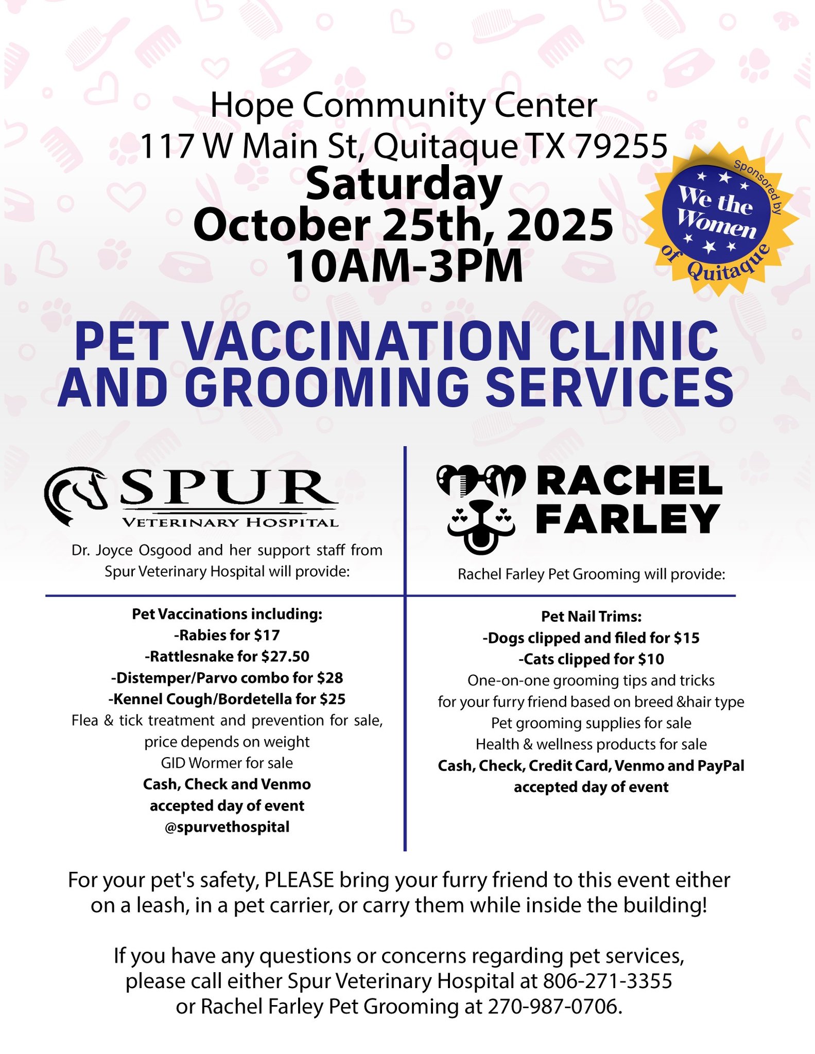 If you have any questions or concerns regarding pert services, pleas call either Spur Veterinary Hospital at 806-271-3355 or Rachel Farley Pet Grooming at 270-987-0706.