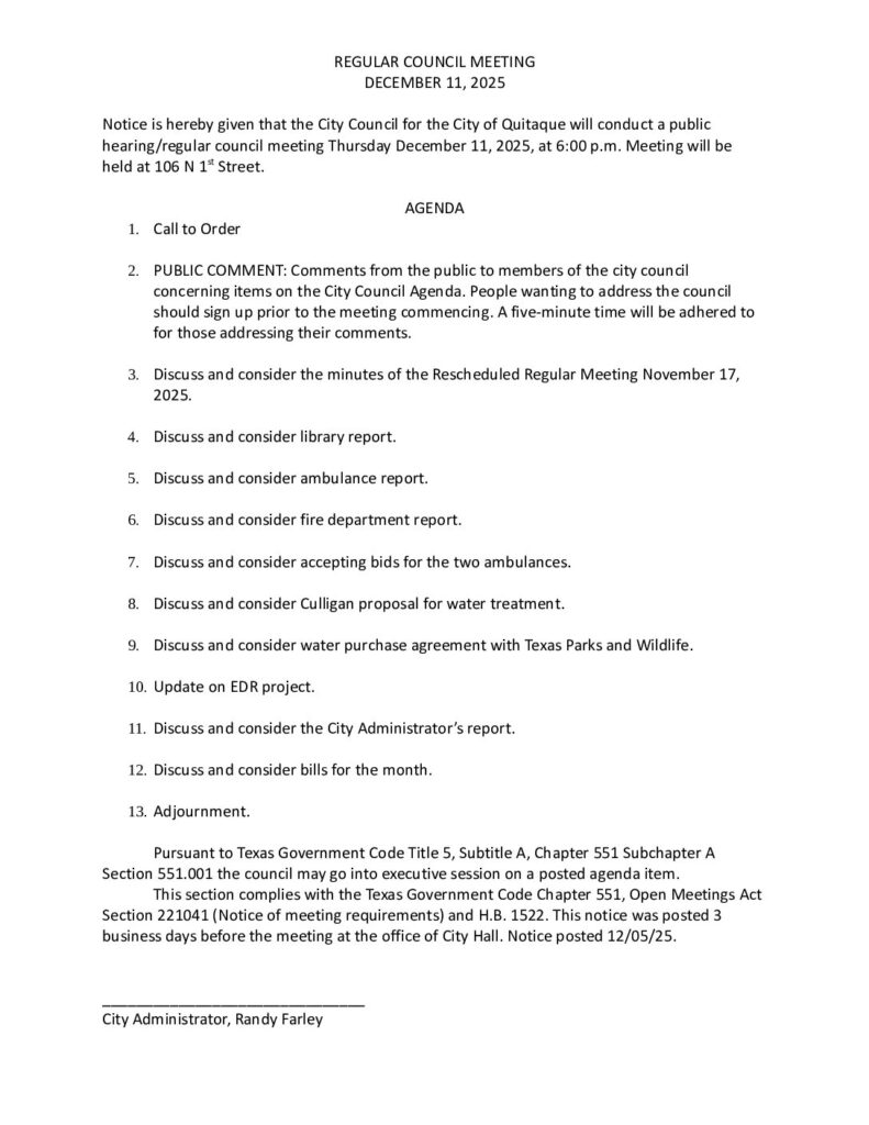 Notice is hereby given that the City Council for the City of Quitaque will conduct a public hearing/regular council meeting Thursday December 11, 2025, at 6:00 p.m. Meeting will be held at 106 N 1st Street.