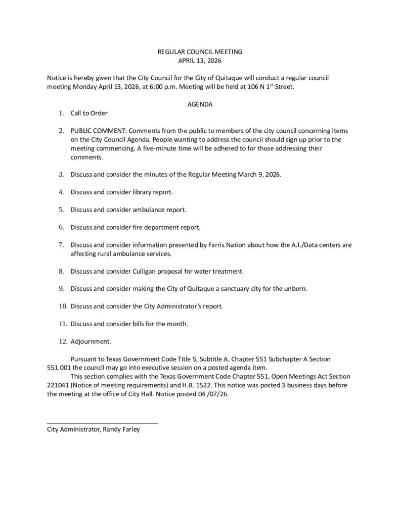 Notice is hereby given that the City Council for the City of Quitaque will conduct a regular council meeting Monday April 13, 2026, at 6:00 p.m. Meeting will be held at 106 N 1st Street.